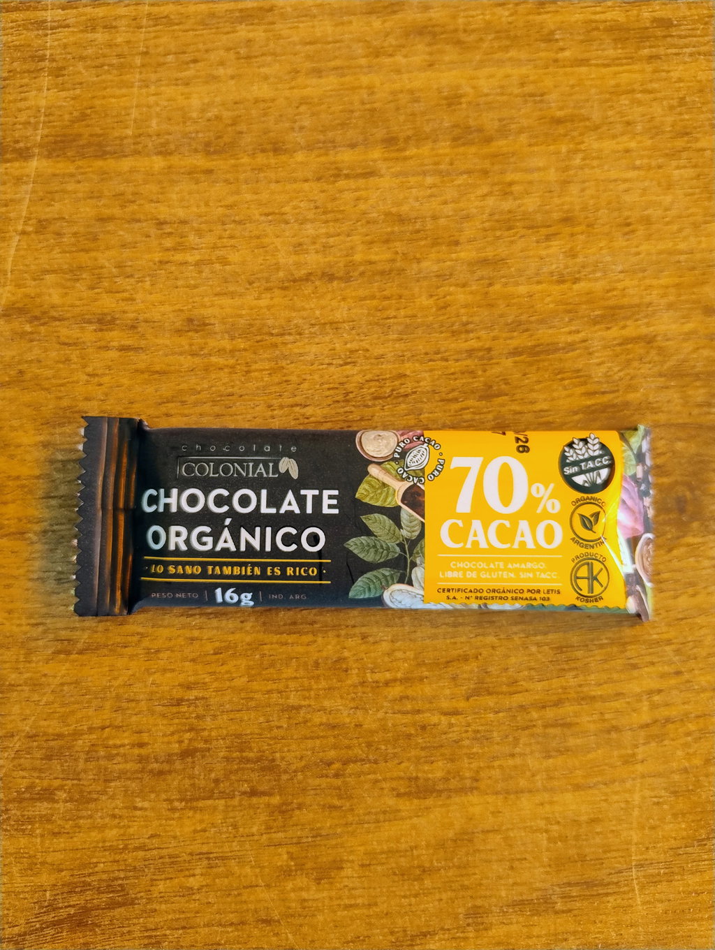 Chocolate Orgánico en Barrita x 16 Gr. ´´Colonial´´ (70% Cacao)